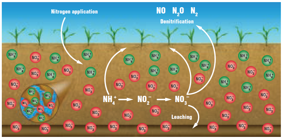 After application, nitrogen sources in the ammonium form (NH4+) convert to the nitrate form (NO3-) via a process called nitrification.