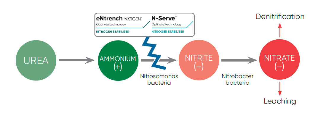 Nitrapyrin is the active ingredient in N-Serve and eNtrench NXTGEN. It inhibits the activity of the Nitrosomonas bacteria for up to 10 weeks. By allowing the nitrogen to stay in the ammonium form (positively charged) longer, these products decrease nitrogen loss from leaching and denitrification and instead store it in the root zone for optimal plant use.