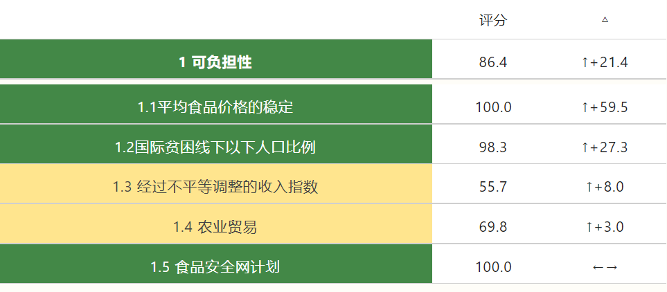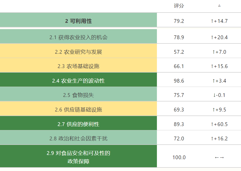 —— 其中,中国在农业生产波动(得分98.6)、供应便利性(得分89.3)和对食品安全和可及性的政策保障(得分100)等指标上的表现达到了“非常好”区间。