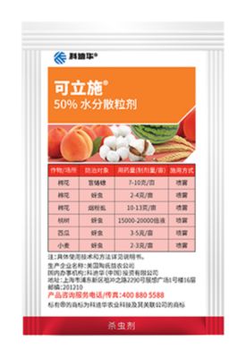 可立施®是新型化学杀虫剂——砜亚胺(sulfoximines)的一员,作用于昆虫神经系统,具有胃毒和触杀作用,用于防治防治棉花烟粉虱和盲蝽蟓,以及小麦、桃树和西瓜蚜虫。