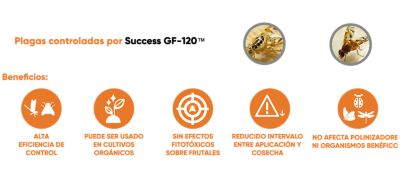 Spinosad, ingrediente activo de Success GF-120™ 0.02 CB, es producido naturalmente a partir de el actinomiceto Saccharopolyspora spinosa. Spinosad es una mezcla de los spinosines más activos A y D, que han demostrado un excelente control de muchas especies de insectos que atacan a los cultivos. Success GF-120™ 0.02 CB posee efecto por ingestión (estomacal) y contacto.