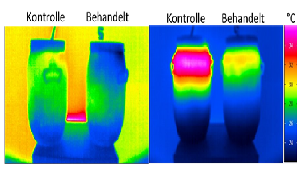 Die Wirkung der RAPID REACT®-Produkte wird in Abbildung 1 noch einmal deutlich. Unter gleichen Bedingungen wurden die Silagen nach zehn Tagen Silierdauer geöffnet, so dass Umgebungsluft an die simulierte „Anschnittsfläche” gelang. Das linke Bild wurde drei Tage und das rechte Bild sieben Tage nach der Öffnung aufgenommen. Es wird deutlich, dass jeweils das behandelte Material einer reduzierten Nacherwärmung unterliegt (blaue Farbe). Die unbehandelten Kontrollen zeigen eine deutlich eher eintretende und ausgeprägtere Nacherwärmung auf (gelb-rote Farbe).