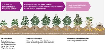 Ein Spritzstart mit Zorvec Entecta schafft von Anfang an einen „reinen Tisch“ und nimmt den Druck aus den Folgebehandlungen. In der sich anschließenden Phase des stärksten Laubzuwachses schützt Zorvec Entecta die Kartoffelpflanze sicher gegen Sekundärinfektionen. Durch die besondere Wirkstoffmobilität werden auch die sich gerade erst entwickelnden Blätter zuverlässig geschützt. Zorvec Entecta ist bereits nach 20 min sehr regenfest und bietet Sicherheit auch bei unbeständigen Witterungsbedingungen.