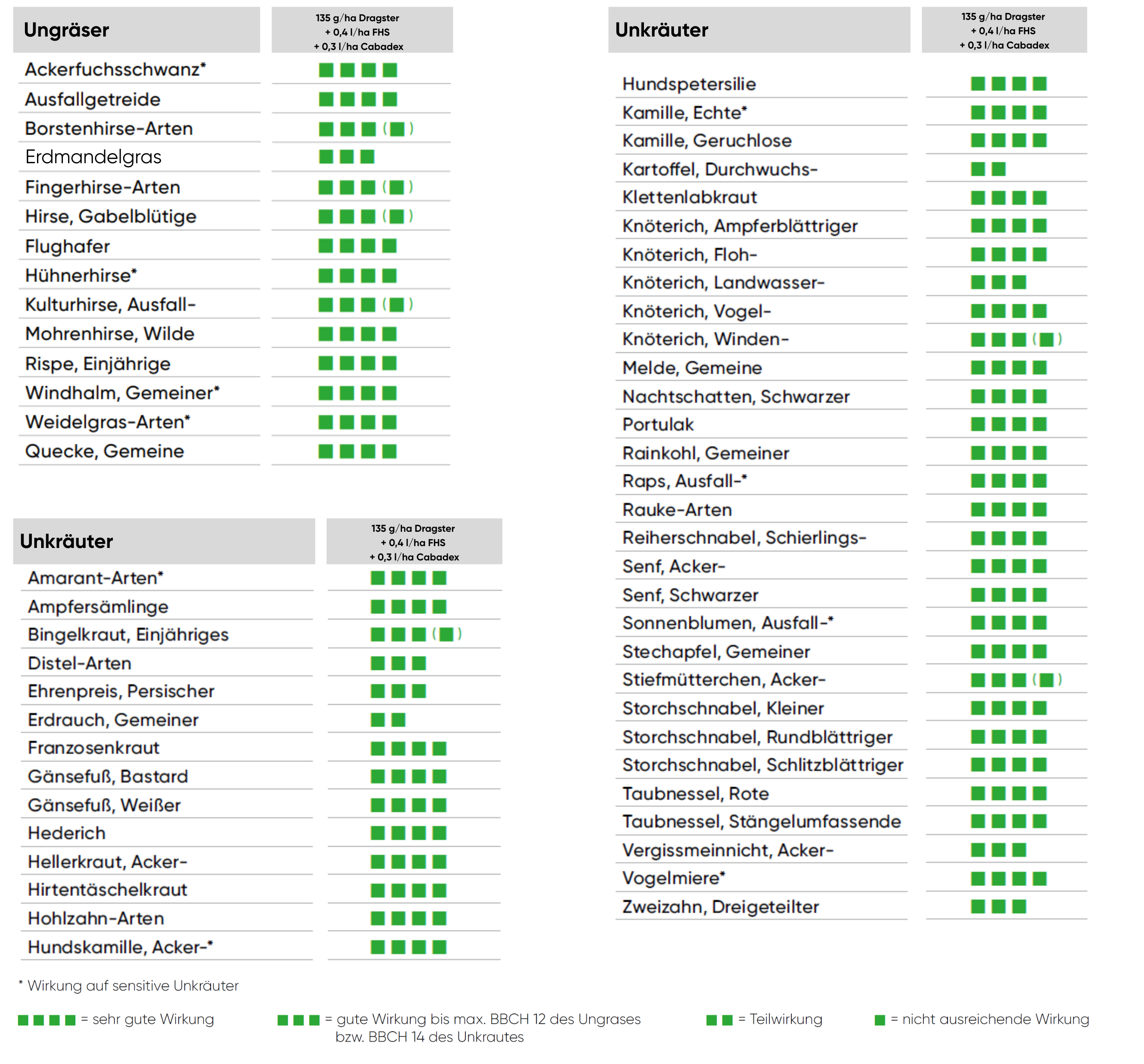 | Empfehlung | Einmalanwendung: 135 g/ha Dragster + 0.4 l/ha Vivolt + 0.3 l/ha Cabadex Splittinganwendung: 85 g/ha Dragster + 0.4 l/ha Vivolt + 0.3 l/ha Cabadex → 50 g/ha Dragster + 0.4 l/ha Vivolt | |