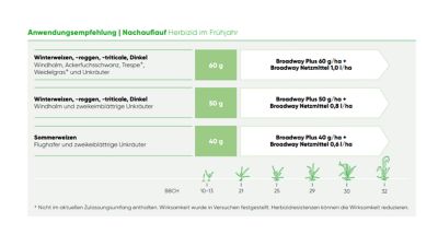 Im Broadway Plus werden die bekannten Wirkstoffe Pyroxsulam und Florasulam durch den innovativen Wirkstoff Arylex™ active effektiv ergänzt. Im Vergleich zum bekannten Broadway sorgt diese Wirkstoffkombination für ein noch breiteres Unkrautspektrum und es werden zusätzliche Unkräuter wie Taubnessel, Erdrauch, Melde, Gänsefuß-Arten kontrolliert.