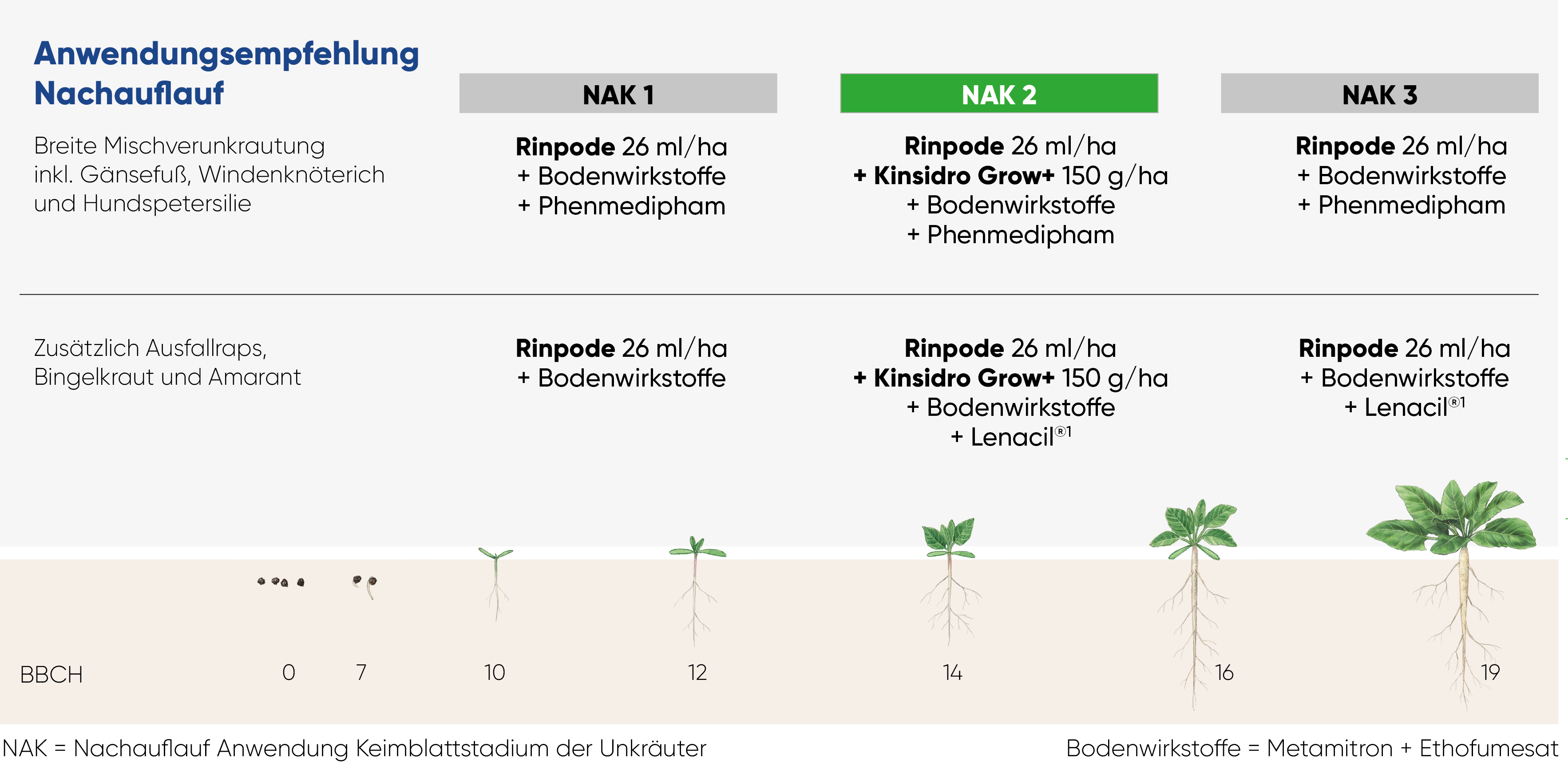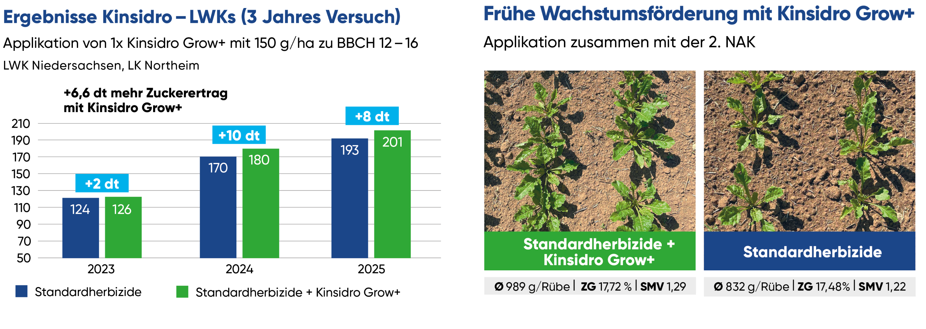 3x 26 ml/ha (Empfehlung in den NAKs) Kinsidro Grow+ 150 g/ha bei NAK 2