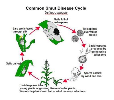 Der Pilz überdauert circa 6 – 10 Jahre an Pflanzenresten oder im Boden in Form von Teliosporen. Auch am Korn können Sporen haften. Die Verbreitung auf den Feldern erfolgt in der Regel über Wind und Regen. Bei höheren Temperaturen und genügend Feuchtigkeit keimen die diploiden Teliosporen und bilden über die Meiose haploide Basidiosporen. Diese ernähren sich nur saprophytisch. Sind die Umweltbedingungen gut und finden sich passende andere Basidiosporen, verschmelzen diese und bilden Infektionshyphen, die über ein sogenanntes Appressorium in verletztes, wachsendes (also meristematisches) Gewebe bzw. die Zellen eindringen können. In der Pflanze induziert der Pilz dann ein verstärktes Zellwachstum und eine Vergrößerung der Zellen. Die normale Entwicklung des Pflanzengewebes stoppt. In diesem Tumor wächst er zunächst zwischen den Zellen und bildet die halb durchsichtig erscheinende Haut der Beulen. Dann dringt er in die vergrößerten Zellen ein, die daraufhin absterben. Er ernährt sich vom Zellinhalt und produziert Massen von neuen Teliosporen. 10 – 14 Tage nach der Infektion werden die Gallen sichtbar. 21 – 23 Tage nach Infektion sind die neuen Teliosporen reif. Die Beulen platzen auf, die innere schwarze Sporenmasse trocknet und verbreitet sich erneut mit Wind und Regen. In einer Galle sind bis zu 200 Milliarden Sporen. Im Laufe der Vegetationsperiode können so bei günstigen Bedingungen für die Sporen weitere Teile der Pflanzen infiziert werden.