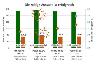 In den Jahren 2014, 2015, 2016 und 2017 war in den Aussaat- und Ernteterminversuchen der Landwirtschaftskammer Niedersachsen die Variante mit der früheren Aussaat und der späteren Ernte am Besten im Stärkeertrag.