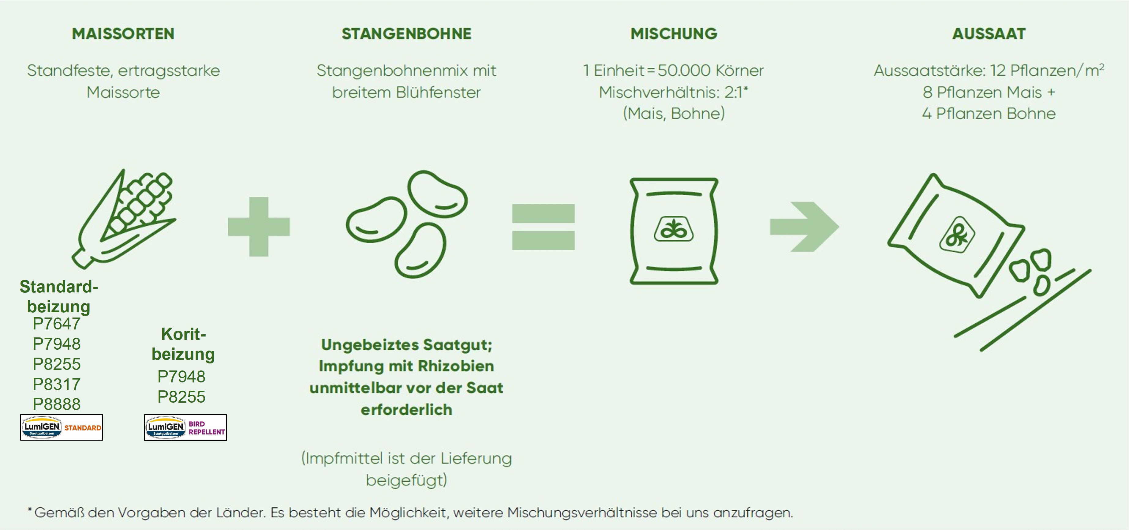 Die "GLÖZ 7"- Vorgabe, welche im Rahmen der Gemeinsamen Agrarpolitik entstanden ist, stellt insbesondere Futterbaubetriebe vor Herausforderungen. Die Lösung: Maisgemenge (Maismischkulturen) als Hauptkultur, um den Fruchtwechsel nach "GLÖZ 7" zu erfüllen. In unserem Portfolio bieten wir eine Vielzahl von Pioneer Maissorten an, welche in fertigen Mischungen mit Stangenbohnen angeboten werden.