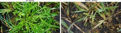 Til venstre ses resistent fuglegræs som er behandlet med en SU-løsning. Effekten udebliver totalt. Til højre ses effekten af Rexade 440 som bekæmper denne type af resistent fuglegræs med fuld effekt.