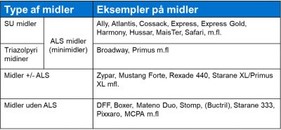 Når man taler om resistent bredbladet ukrudt, taler man om ALS-resistent ukrudt navngivet efter midlernes virkningssted i planten. Desværre er det denne gruppe af midler, hvorpå hovedparten af specielt forårsindsatsen er baseret. ALS-gruppen består af 2 undergrupper kaldet minimidler (SU) og triazolpyrimidiner. Denne underdeling er af stor betydning for, hvilken effekt man vil opleve i marken. Til gruppen af minimidler hører Express™, Ally™, Hussar™, Cossack™ mfl. Efter gentagne sprøjtninger med disse midler udvikles der med al sandsynlighed resistens i marken og denne resistens betegnes SU-resistens. Mod SU-resistent ukrudt virker triazolpyrimidinerne stadig og derfor vil man opleve, at Primus™ (florasulam) stadig kan bekæmpe SU-resistent ukrudt, selvom Primus i sig selv er ALS-kemi. Efter gentagne behandlinger med Primus, vil der med stor sandsynlighed også udvikles resistens over for Primus og resistenstypen betegnes ALS-resistens. Mod denne type af resistent ukrudt skal der ses på løsninger som indeholder noget andet end ALS-kemi.