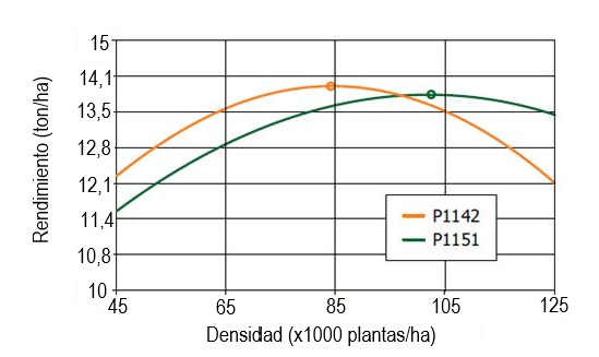 Los científicos de Pioneer llevan a cabo miles de ensayos de investigación de campo en cientos de lugares cada año en toda Norteamérica para ayudar a entender la respuesta del rendimiento del grano a la tasa de siembra de los híbridos de la marca Pioneer®. Además, muchos agricultores tienen sus propios datos sobre las tasas de siembra variables, recopilados a partir de los datos sobre el estado de la siembra y el rendimiento. Décadas de investigación de Pioneer han demostrado que la respuesta del rendimiento del maíz a la tasa de siembra dentro de un rango comercialmente relevante puede ser generalmente bien descrita por una función cuadrática. El rendimiento del grano aumentará con la tasa de siembra hasta un punto óptimo y luego disminuirá a medida que la tasa de siembra se incremente por encima del óptimo debido a una mayor tasa de esterilidad y a la prolongación de los intervalos de antesis-ensilaje (Jeschke et al., 2009). La tasa de siembra óptima puede variar en función de la genética del híbrido. La Figura 2 muestra un ejemplo de funciones de respuesta cuadrática para 2 familias de híbridos con el mismo CRM que han demostrado diferir en su respuesta a la población de plantas en los ensayos de investigación de Pioneer.