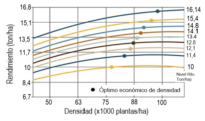 La respuesta del rendimiento a la tasa de siembra por nivel de productividad es el factor crítico para crear recomendaciones de siembra de tasa variable. La cantidad necesaria para maximizar el rendimiento aumenta a medida que aumenta el nivel de rendimiento. Cuando se agrupan por nivel de rendimiento, los resultados de los ensayos de población de plantas de Pioneer mostraron que la tasa de siembra óptima económica aumentó de aproximadamente 77 500 semillas/ha en el nivel de rendimiento de 10 ton/ha a más de 97 500 semillas/ha en el nivel de rendimiento de 16,1 ton/ha (Figura 3). Un estudio de la Universidad del Estado de Iowa en el que se comparaba la respuesta del rendimiento del maíz con la cantidad de plantas en suelos con diferentes grados de idoneidad para el maíz reveló resultados similares. Los suelos más productivos tendían a tener una mayor cantidad óptima para el máximo rendimiento (Woli et al., 2014).