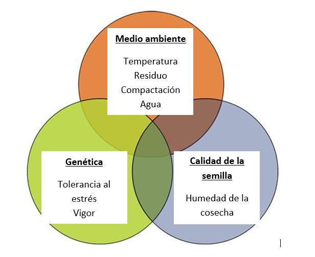 El éxito de la emergencia del maíz es una combinación de tres factores clave: el entorno, la genética y la calidad de la semilla (Figura 1). La genética de los híbridos es la base de la tolerancia al estrés por frío. La alta calidad de la semilla ayuda a garantizar que la semilla se comporte de acuerdo con su capacidad genética. Los productos de maíz de la marca Pioneer se seleccionan para proporcionar la mejor genética para un rendimiento constante en una amplia gama de entornos, y las prácticas de producción de semillas se optimizan para obtener la máxima calidad. Sin embargo, incluso con la mejor genética y la mayor calidad de las semillas, los factores ambientales pueden influir en el establecimiento del rodal. Una combinación de investigaciones de campo y de laboratorio sobre los efectos de las condiciones de estrés en la germinación y la emergencia del maíz proporciona información valiosa que puede ayudar a los agricultores a tomar decisiones informadas y a gestionar mejor sus operaciones de campo para maximizar los rodales.