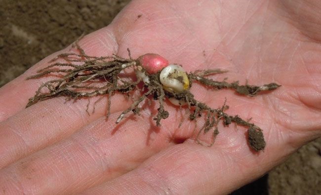 Figura 6. Desarrollo anómalo del mesocotilo y del coleóptilo debido al estrés por frío en un campo de Illinois sembrado de forma temprana.