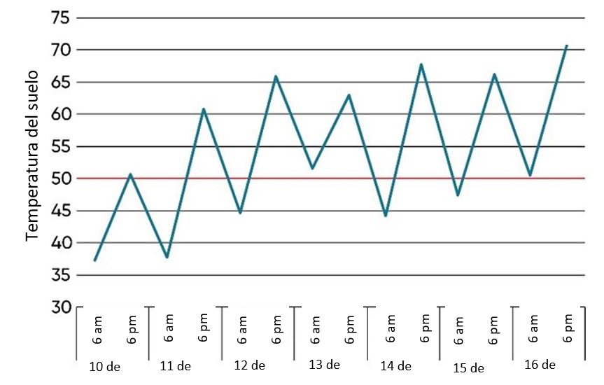 Figura 9. Temperaturas del suelo a las 6:00 horas y a las 18:00 horas durante siete días después de la siembra en una ubicación de campo de emergencia con estrés cerca de Eau Claire, WI en 2015.