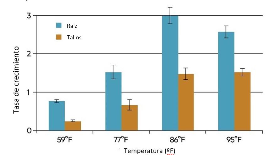 Figura 2. Promedio de las tasas de crecimiento temprano de las raíces y los brotes de tres híbridos a cuatro temperaturas del suelo que van de 15 a 35ºC.