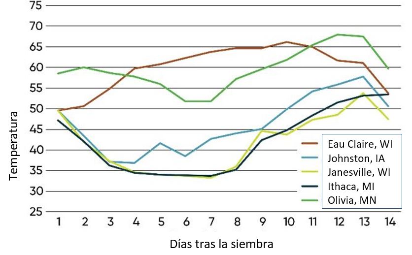 Las temperaturas del suelo en primavera pueden variar mucho de un año a otro. Las temperaturas del suelo en el momento de la siembra, en combinación con las tendencias meteorológicas a corto y medio plazo, tienen grandes repercusiones en la probabilidad de establecer campos óptimos y de alcanzar los máximos rendimientos. Los investigadores registraron las temperaturas medias del suelo en la profundidad de la siembra en varios lugares de investigación de emergencia con estrés en 2018 (Figura 3).