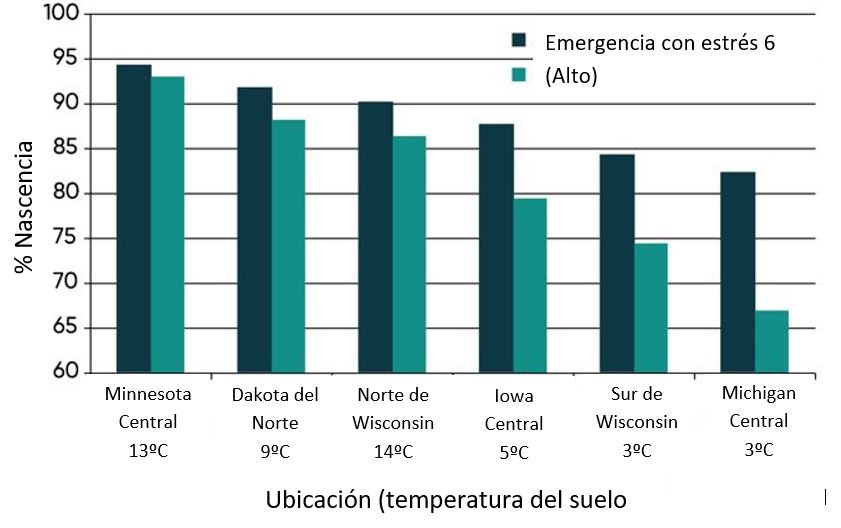 En 2018, se observó una amplia gama de condiciones de emergencia con estrés y temperaturas del suelo en las parcelas de campo de emergencia con estrés. Para demostrar cómo se relacionan los índices de emergencia con estrés con el establecimiento del cultivo en el campo, los híbridos se agruparon por «emergencia con estrés bajo», aquellos con un índice de emergencia con estrés de 4, y por «emergencia con estrés alto», aquellos con un índice de emergencia con estrés de 6.