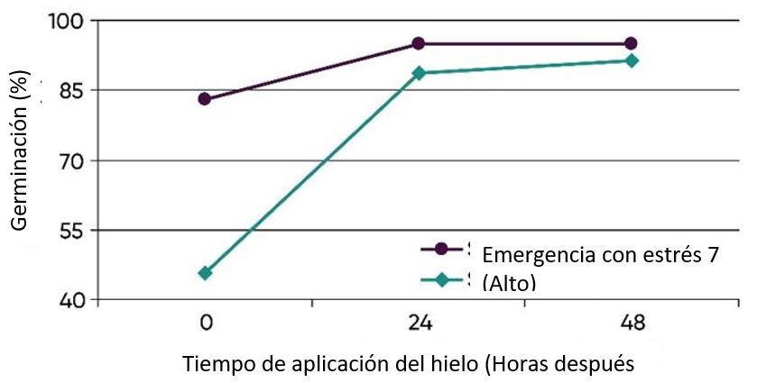 Ambos híbridos mostraron una pérdida significativa de rodales cuando el estrés por frío se impuso inmediatamente (0 horas). Sin embargo, el híbrido con una mayor puntuación de emergencia con estrés tuvo un mayor porcentaje de germinación que el híbrido con una baja puntuación de emergencia con estrés. Las tasas de germinación de ambos híbridos mejoraron considerablemente si se les permitía absorber agua y germinar a temperaturas más cálidas durante, al menos, 24 horas antes de aplicar el hielo.