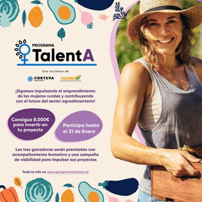 El Programa TalentA, puesto en marcha por la compañía agrícola Corteva Agriscience y la organización de referencia entre las mujeres del ámbito rural, FADEMUR (Federación de Asociaciones de Mujeres Rurales en España), está a punto de culminar su tercera edición. En este sentido, todas las interesadas en formar parte y optar a alguno de los premios para impulsar sus proyectos podrán presentar su candidatura hasta el 31 de enero.