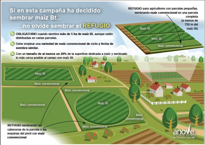 Si esto no fuera posible deberá establecerse en una parcela que se encuentre a menos de 750 m del maíz Bt DIFERENTES OPCIONES SON POSIBLES Y PUEDEN SERVIR PARA FACILITAR LA COEXISTENCIA: El maíz convencional del refugio debe manejarse de forma idéntica al maíz Bt, eligiendo un híbrido del mismo ciclo. No se recomienda aplicar tratamientos contra los taladros y nunca debe utilizarse un insecticida a base de preparados microbianos de B. thuringiensis.