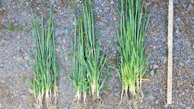 Kinsidro Grow+ käsittelyn ansiosta kasvi kasvaa rehevämmin. Oikella käsittelemätön ja vasemmalla Kinsidro Grow+ käsittelyn saanut kaura.