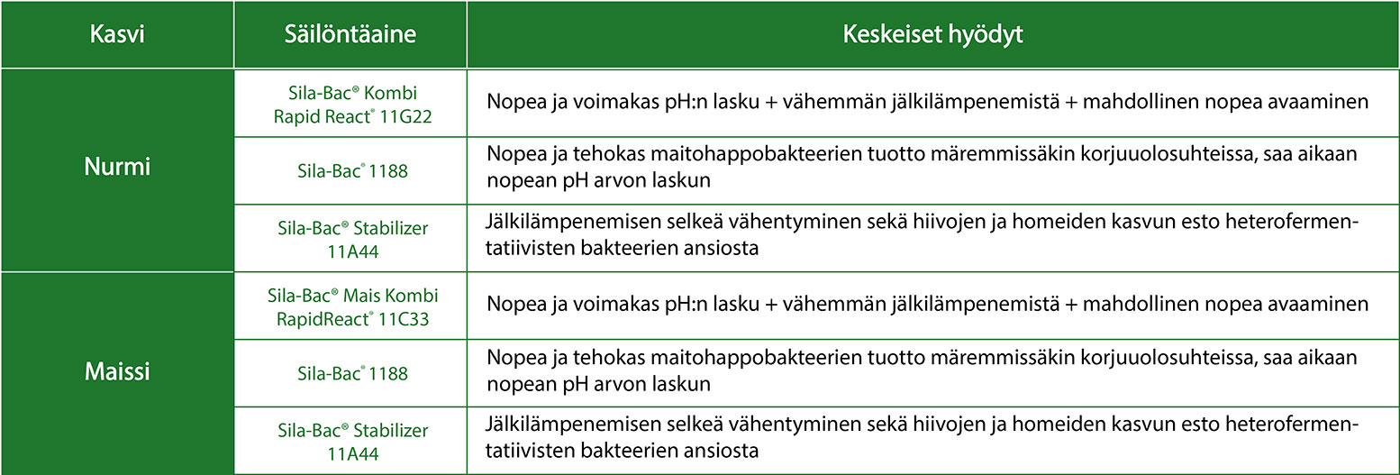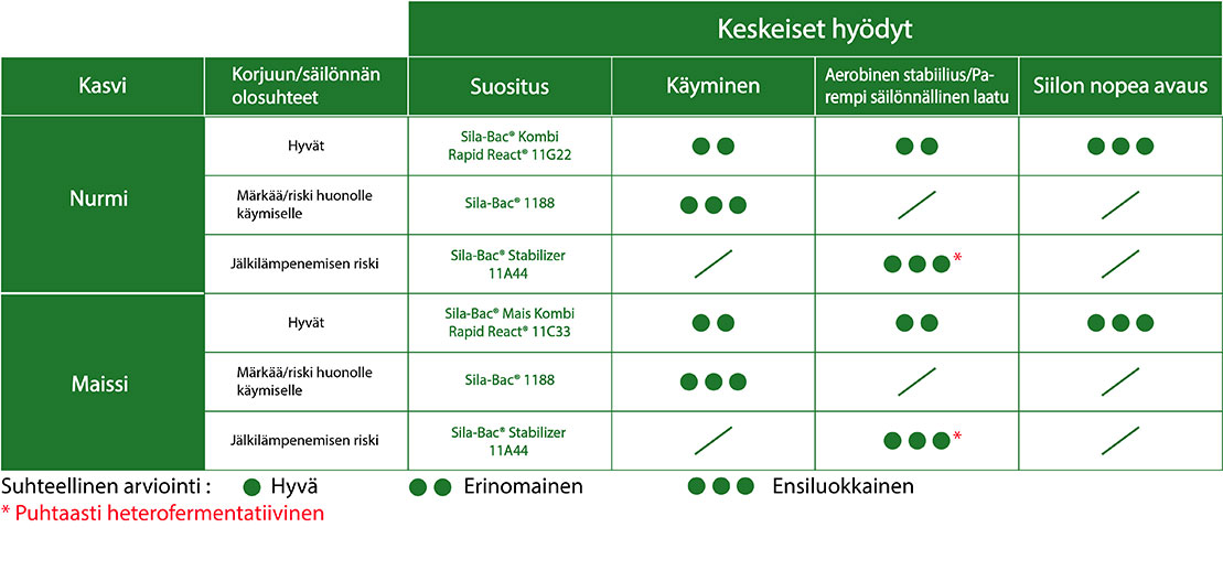 - Mikäli SILA-BAC® tuotteiden annosteluohjeita noudatetaan niin käyttömäärällä saadaan 100.000 lisääntyvää yksikköä bakteeria per gramma tuoretta säilörehua maailmanlaajuisten standardien mukaan