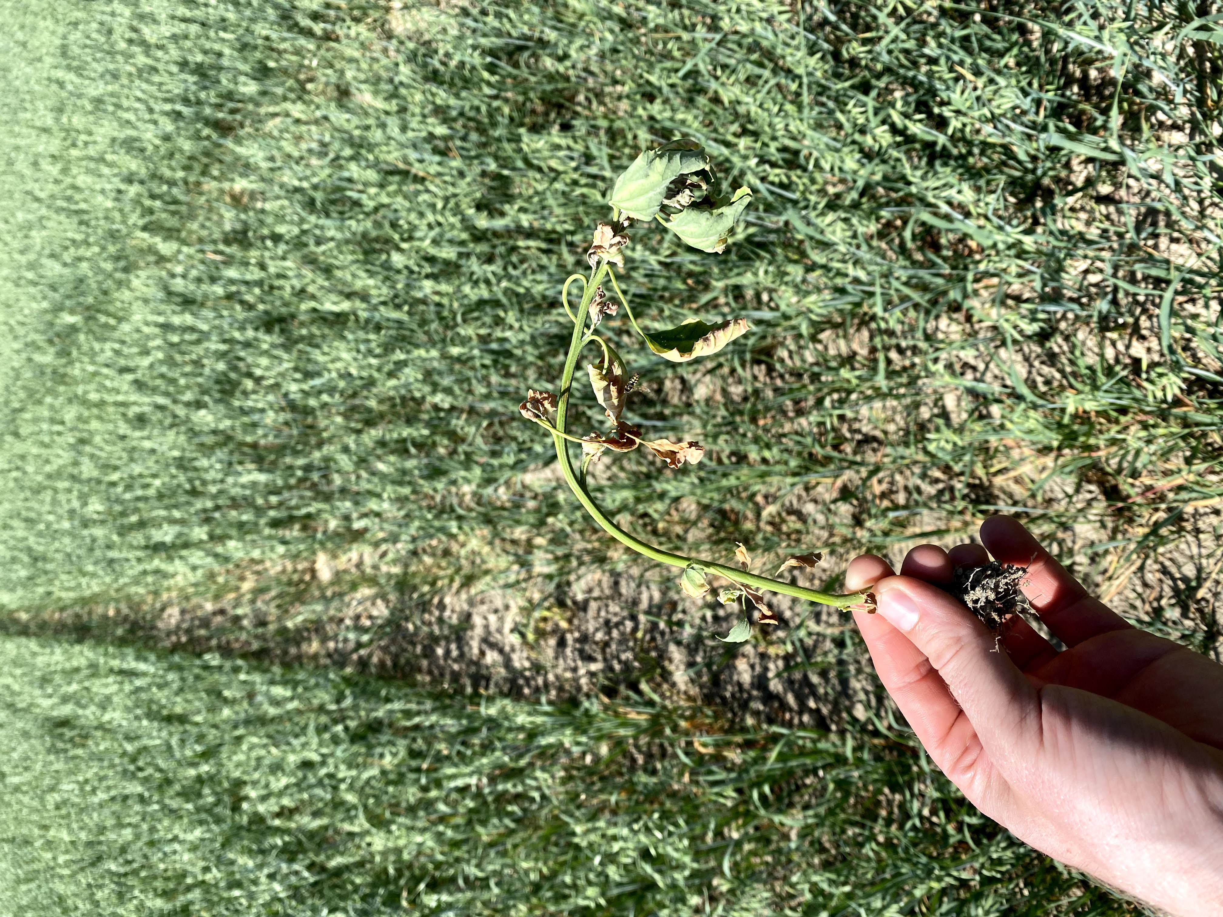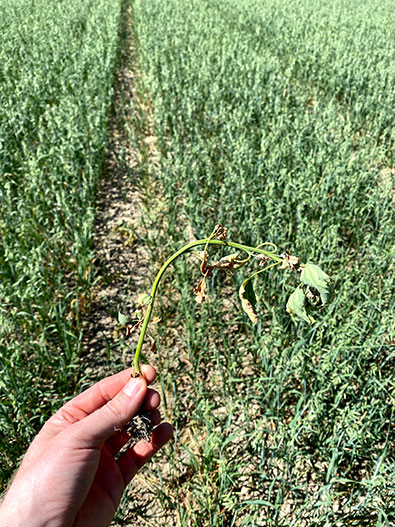 Riihimäellä kärsittiin myös kuivuudesta 2021 kasvukaudella. Jauhosavikka on haastava torjuttava, kun se kasvaa kuivissa oloissa. Se kasvattaa paksun vahakerroksen, joilloin moni aine on vaikeuksissa sen torjunnassa. Käytetty tankkiseos kuitenkin vaakuutti tehoillaa myös kuivassa kasvaneisiin rikkakasveihin. Kuvassa esimerkkinä kuivassa kasvanut kookas jauhosvaikka, johon teho on ollut erinomainen.
