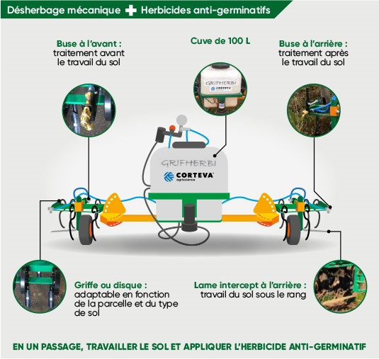 GrifHerbi se présente sous forme d’un kit à adapter à votre matériel existant. Ce kit est constitué d’une cuve de 100 L et d’un système de buses que le viticulteur installe sur son outil de travail du sol. Des essais conduits par Corteva en 2020 ont montré une meilleure efficacité de l’herbicide anti-germinatif lorsqu’il est appliqué après le travail du sol plutôt qu’avant.