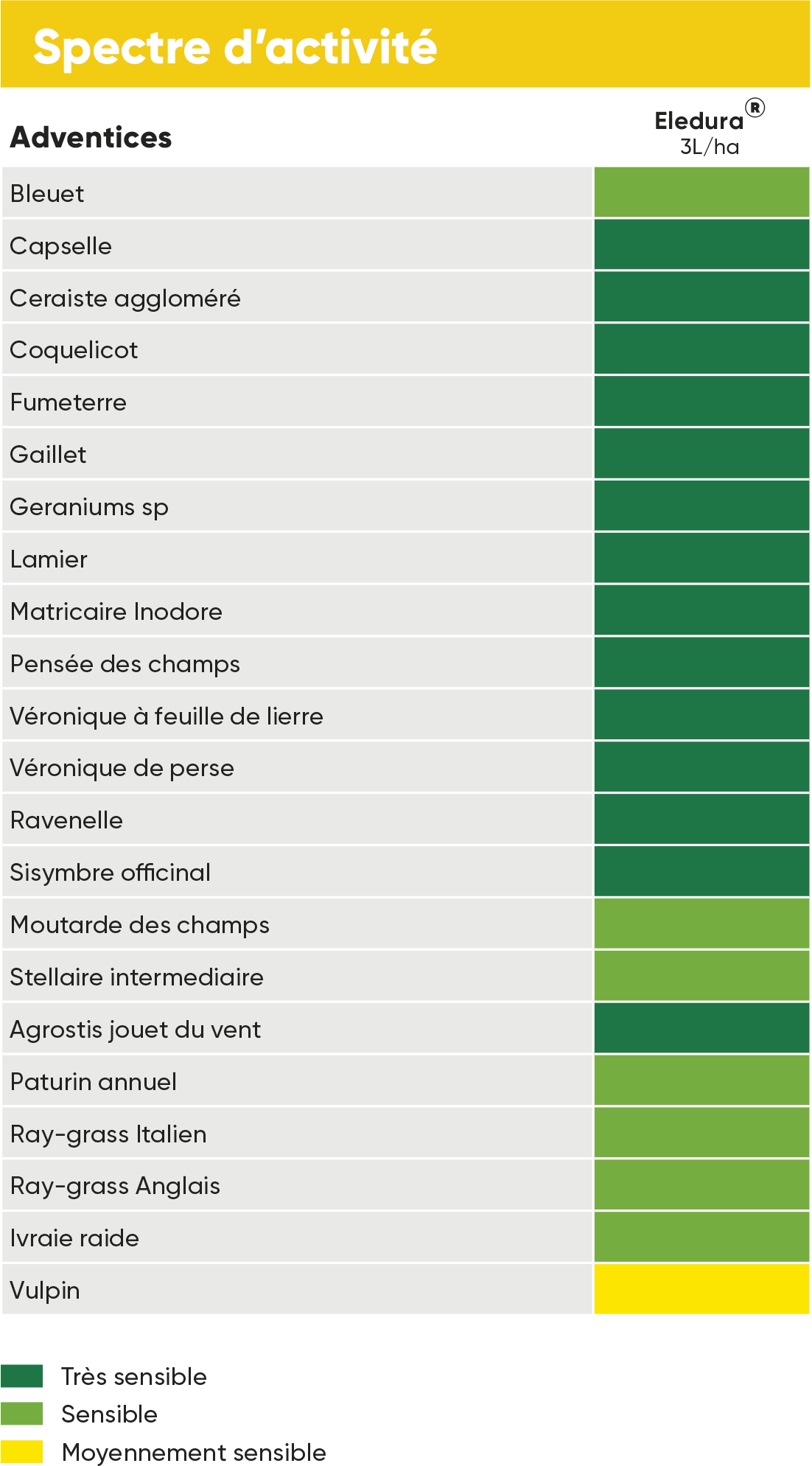 Eledura® est un herbicide antigraminées à large spectre antidicotylédones, pour le désherbage précoce de post-levée de vos céréales à paille.
