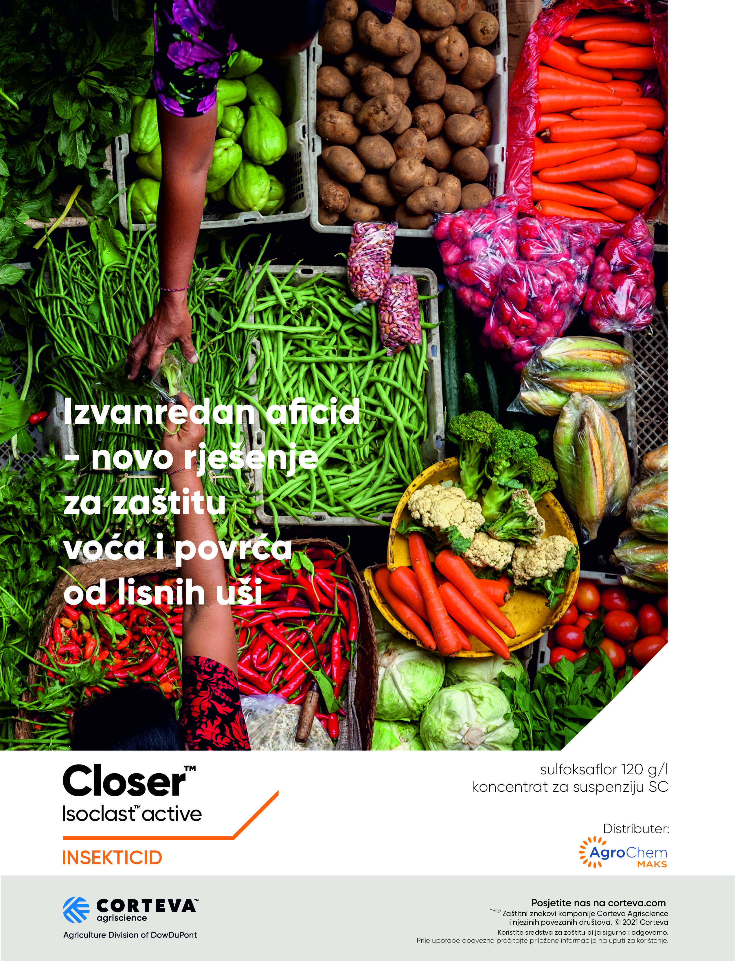 Novi insekticid Closer ™ je u RH registriran u mnogim voćnim proizvodnim kulturama (jabuka, kruška, breskva, trešnja, višnja i agrumima) za suzbijanje: krvave uši, jabučne pepeljaste uši, zelene breskvine uši, trešnjina uš, kalifornijske štitaste uši, dudove štitaste uši, žute narančine štitasta uši te narančin trnoviti štitasti moljac, ali i u povrtnim kulturama kao što su: krumpir, rajčica, paprika, patlidžan, krastavci, dinja, lubenica, tikva, špinat, salata, kupus, cvjetača, brokula te cvijeću i ukrasnom bilju za suzbijanje salatne lisne uš, zelene breskvina uš, pamukova lisne uši, crna bobove uš, ružina lisna uš i dr.