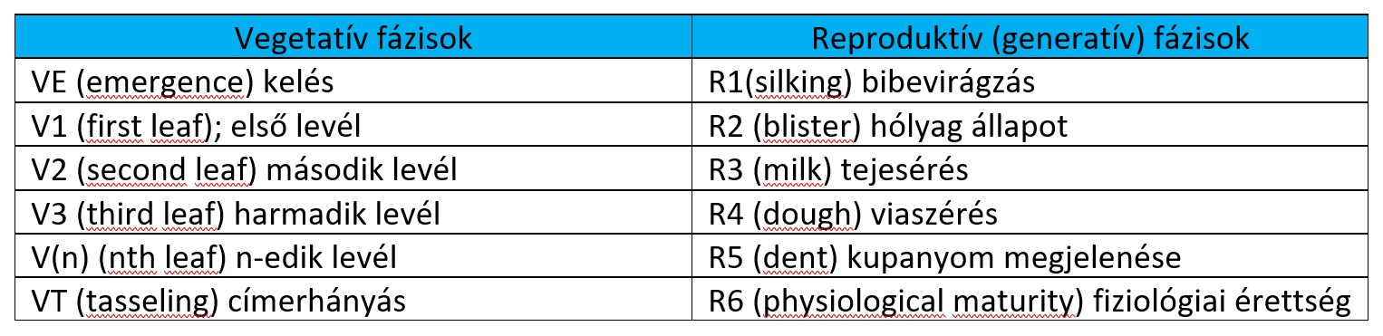 Ahogyan az 1. táblázatban látható, a kukorica fejlődési fázisait vegetatív (V) és reproduktív (generatív) szakaszokra (R) osztottuk. Az V fázisok szakaszait számszerűen V1, V2, V3 stb. jelöléssel jelöltük V(n-ig), ahol (n) a VT előtti utolsó leveles állapotot jelöli a vizsgált hibrid esetében. Az első és az utolsó V szakaszt VE (kelés) és VT (címerhányás) jelöléssel láttuk el. A levelek száma (n) ingadozni fog a hibrid és a környezeti különbségek függvényében. A vegetatív szakaszokat és a reproduktív szakaszok hat fázisát az 1. táblázatban számszerűen is jelöltük.