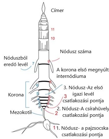 Az egyes levélstádiumokat az a legfelső levél határozza meg, melynek látható a levélnyaka. A levélnyak első látható része a hátoldal, amely a levéllemez és a levélhüvely között elszíneződött vonalként jelenik meg. A jellegzetesen ovális alakú első levél referenciapont a felfelé számolásnál a felső látható levélnyakig, ahogyan az 1. ábrán látható.