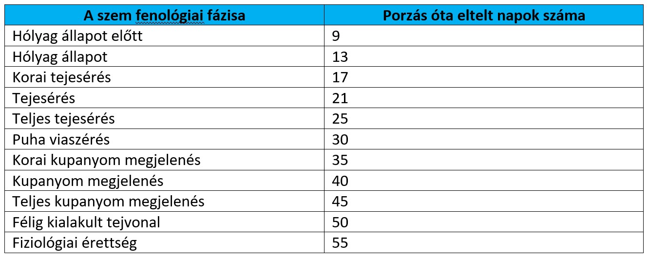 Fiziológiai érettség (R6) - A tejvonal már nem látszik, a fekete réteg megjelent. A növény elérte a maximális száraz tömeget.