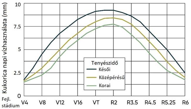 A napi evapotranspiráció (ET) mértéke nagymértékben változik a tenyészidőszak során az időjárási viszonyoktól. Általánosságban elmondható, hogy a napi (ET) érték növekszik a vegetatív növekedési szakaszokban, csúcspontja a virágzás és megtermékenyülést követő időszakban van, a szemtelítődés ideje alatt pedig fokozatosan csökken. Csúcsidőszakban a kukorica (virágzástól - hólyagosodás vége) elérheti az átlag napi 9 mm-t, de forró, száraz, szeles napokon akár még napi 12-13 mm vízfelhasználás is történhet.