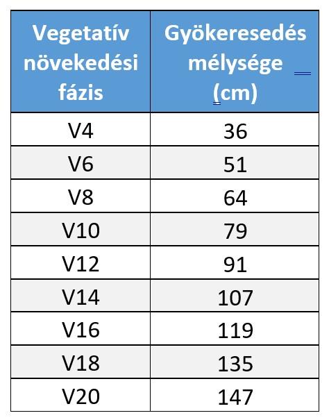 2. táblázat: Kukorica gyökér vertikális növekedése a vegetatív szakaszok során