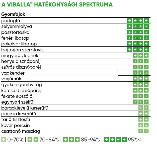 Néhány jelentős kárt okozó gyomnövény annyira érzékeny a Viballára, hogy 2-4 leveles állapotuk után is megfelelő hatékonysággal védekezhetünk ellenük. Ilyen például a parlagfű, selyemmályva, bojtorján szerbtövis, fehér libatop és pokolvar libatop.