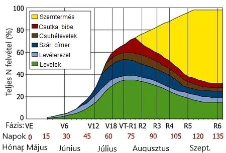 Ahogy a diagram mutatja, a kukorica teljes nitrogénigényének több, mint felét 8 leveles fejlettsége és címerhányás között igényli, mely időszak akár 30 nap alatt is lefuthat, amennyiben a hőmérséklet és a vízellátás a kukorica számára kedvező. A 4-6 leveles korban kiadott állománytrágyázás biztonsági beavatkozásként javasolható, mely arra az időszakra képes a növényt táplálni, amikor időjárási okok, vagy a talajállapot miatt esetleg a későbbre tervezett nagyobb adagú nitrogénpótlás késik. Az ábrából az is látszik, hogy a nagy nitrogénfelvétel nem ér véget a címerhányással, a teljes igény harmada még felvételre vár a cső- és szemképzés során.