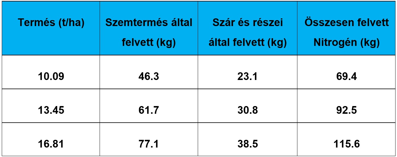 A táblázat a különböző termésszinteken a kukorica által a talajból felvett nitrogén mennyiségét mutatja, ami utal a minimálisan pótolni szükséges nitrogén hatóanyagmennyiségre.