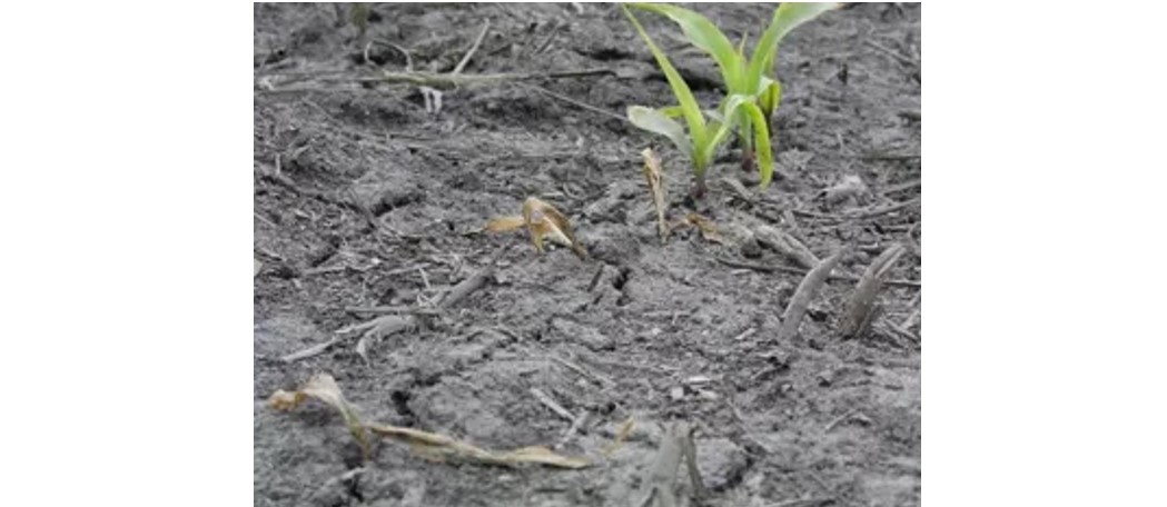 10. ábra: A körülbelül V2 növekedési fázisban lévő kukoricanövények, amelyek magelhalásban pusztultak el. Ezen a területen a vetés után hideg körülmények és telített talajok voltak.