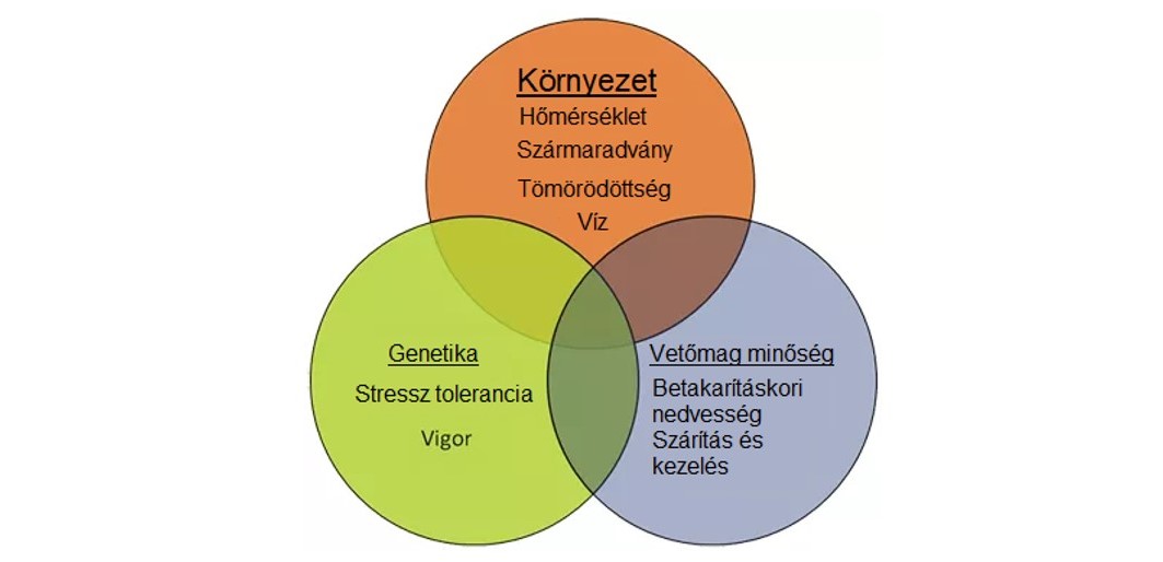 A kukorica sikeres kikelése három kulcsfontosságú tényező együttes hatásától függ – környezettől, genetikától és vetőmag minőségétől (1.ábra). A genetika alapvetően határozza meg a hideg elleni toleranciát. A mag minősége pedig segít biztosítani a mag genetikájának kiteljesedését. A Pioneer® kukoricákat úgy szelektáljuk, hogy a legjobb genetikai alapokat nyújtsuk kiegyenlített teljesítmény elérése érdekében változatos környezeti körülmények mellett, a vetőmag előállítás során pedig a minőség magas szintre emelésére törekszünk. Mindezek ellenére a környezeti tényezők hatásai fennállnak. A stresszes körülmények kukorica csírázására és kelésére kifejtett hatásainak megfigyelése érdekében elvégzett szántóföldi és laboratóriumi kutatások értékes információkat szolgáltatnak annak érdekében, hogy segítsük a gazdálkodók döntéshozatalát és szántóföldi termelésük hatékonyságának maximalizálását.