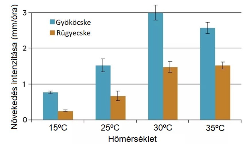 2. ábra. Gyököcske és rügyecske átlagos növekedési intenzitása négy eltérő hőmérsékleti érték esetén