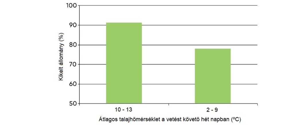 · Homokos területeken ügyeljen arra, hogy az alacsony éjszakai hőmérséklet a talaj hőmérsékletét az ajánlott vetési hőmérséklet alá süllyesztheti. Lazább talajokon a nagy hőmérsékletingadozások is károsíthatják a kelést.