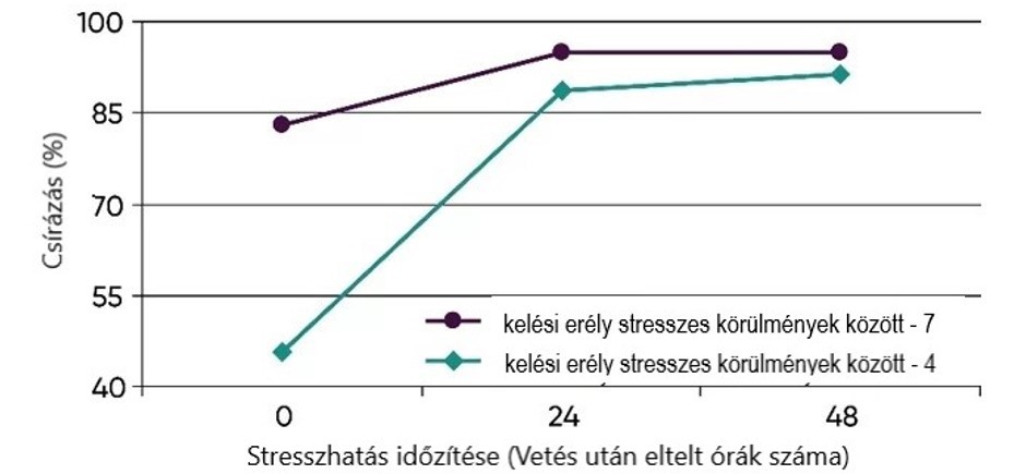 Annak szemléltetésére, hogy a stresszhatások mekkora mértékben befolyásolták a kelést, különböző pontszámokkal látjuk el a hibrideket. A vizsgált hibridek esetében a „kelési erély stresszes körülmények között” kategóriában a 4-es és a 6-os pontszámok kerültek kiosztásra.