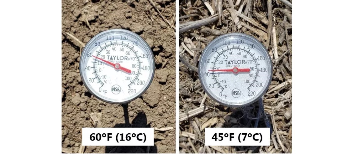 Egyik állomásunkon 2019 április közepén napközben 15 fokos hőmérsékleti különbséget figyeltünk meg ugyanazon a területen a kevés növényi maradvánnyal borított talaj és a kb. 18 méterrel távolabb lévő szójabab maradvány alatti talaj között (9. ábra). Ha eltávolítjuk a maradványokat, akkor melegebb nappali hőmérséklet érhető el és gyorsabb lesz a keléshez szükséges hőösszeg felhalmozódása.
