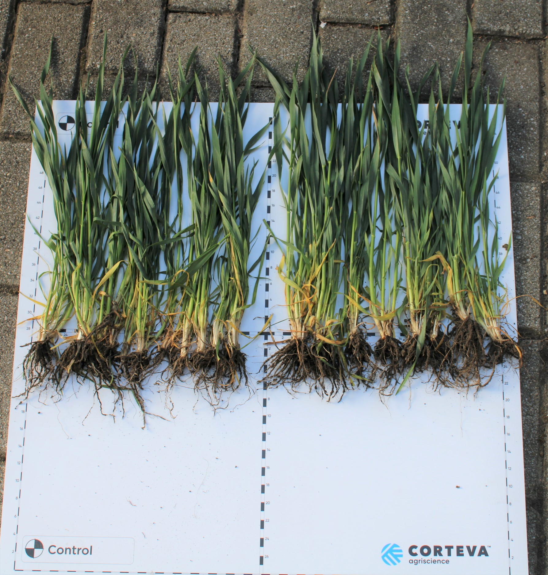 Nádudvar, 2022. március 28. Jobb oldalon az Ympact® csávázott vetőmaggal elvetett területről kiásott búza növények, balra a kezeletlen. A mérések szerint az Ympact® kezelt területről származó növények gyökérhossza 10%-kal, növénytömege 30%-kal volt jobb a kezeletlenhez képest. A növényenkénti hajtásszám (a bokrosodás kezdetén) 30%-kal volt jobb az Ympact® esetében.