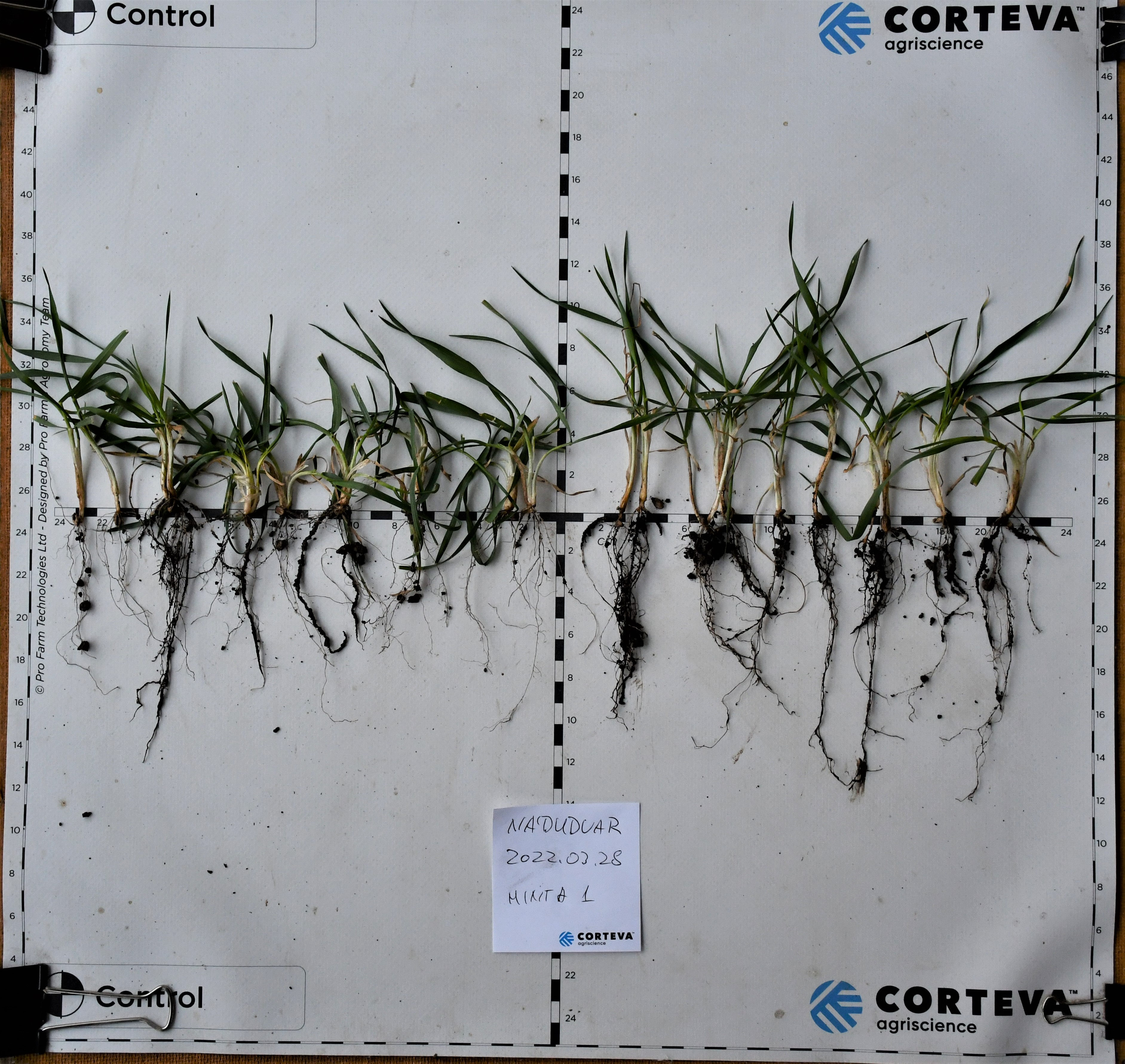 Csárdaszállás, 2022. április 25. Jobb oldalon az Ympact® csávázott vetőmaggal elvetett területről kiásott növények, balra a kezeletlen, búzában. A mérések szerint az Ympact® kezelt területről származó növények gyökérhossza 10%-kal, hajtáshossza 2%-kal, növénytömege 23%-kal volt jobb a kezeletlenhez képest. A növényenkénti hajtásszám (a bokrosodás kezdetén) 11%-kal volt jobb az Ympact® esetében.
