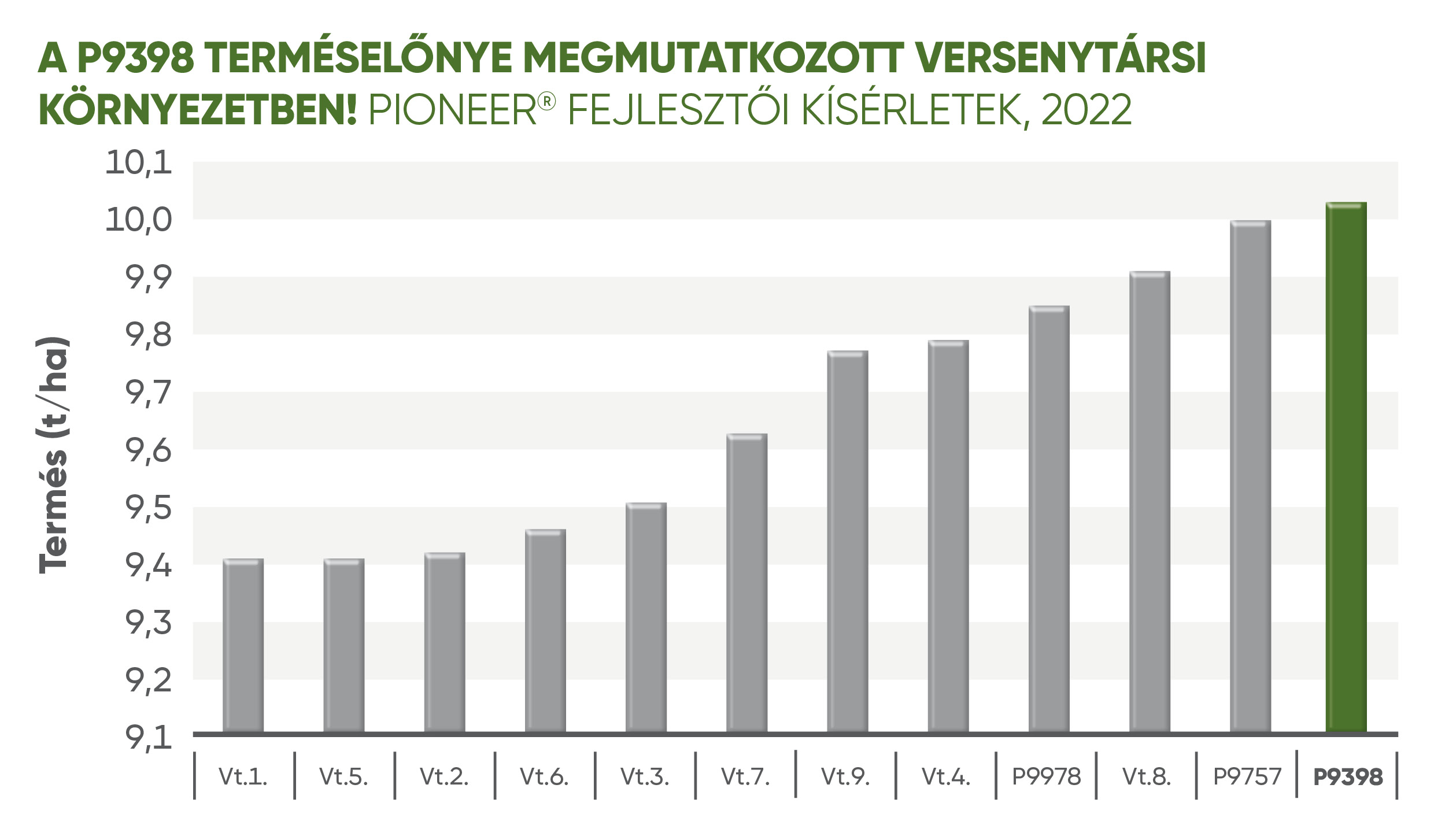 Az tenyészidő szerint haladva első a sorban a P9398 hibrid, FAO száma 370. Hazánkban regisztrált kukorica, 2021-ban a NÉBIH regisztrációs kísérleteiben 105,4%-os termést adott a közismert és magas termésszintű sztenderd hibrid átlagához képest. Kiválóan tolerálja a száraz viszonyokat, ez jól látszott az elmúlt évben fejlesztői kísérleteinkben, ahol dinamikus vízleadása is megmutatkozott. Különösen jól tűri a stresszes körülményeket, ezáltal magasabb tőszámon is terméstöbbletet ad, segítve a profit maximalizálását. Magyarország teljes területére javaslom, minden gazdálkodónak, hiszen a P9398 Optimum® AQUAmax® minősítésű hibrid, ezáltal kiválóan alkalmazkodik száraz viszonyainkhoz!
