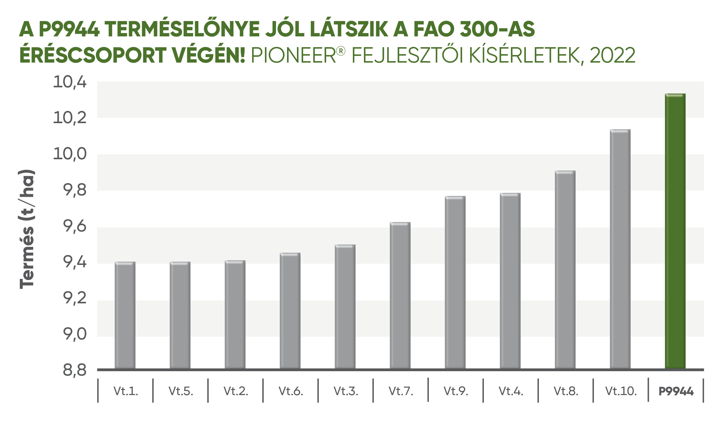 A tenyészidőben felfelé haladva következik az erőteljes megjelenésű P9944 újdonságként, a legújabb generációs kukorica hibridjeink egyik képviselője. A kiugró termésszintjéhez társuló viszonylag alacsony betakarításkori nedvességtartalom miatt emelkedett ki fejlesztői sorainkban. Kiválóan viseli a száraz és stresszes körülményeket, vízleadási dinamikája gyors. Tenyészideje miatt a hazai termelők többségének vetésszerkezetébe könnyen beilleszthető.
